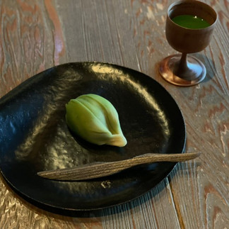 菓子職人の方の登場。目の前でみるみ生菓子が出来上がってくる。名「二葉」。どうやったらここまで香りを閉じ込められるのだろうと不思議に思うくらい、芳醇な新茶の香りが鼻に抜ける。濃茶は各自で選んだ杯に注いでいく。